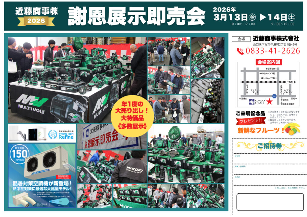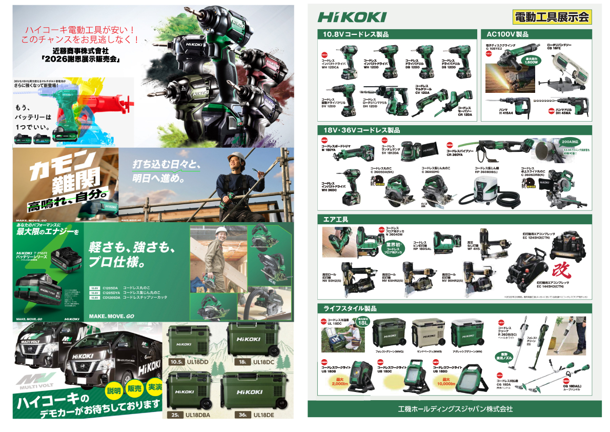 3月13日(金)14日(土)謝恩展示即売会開催!(HIKOKI) 2026.03.02 謝恩展示即売会開催! 3/13(金)10:00~17:00 3/14(土)9:00~15:00 詳しくはこちらのチラシをご覧ください!